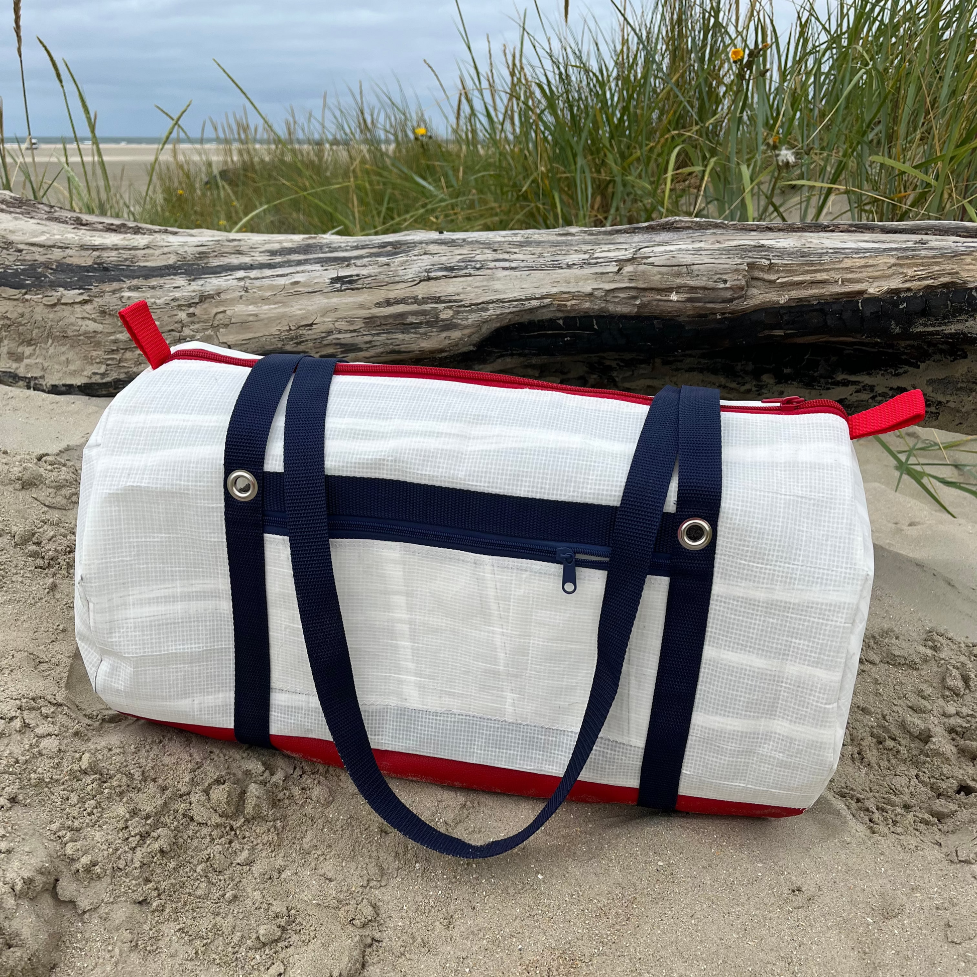 Diese runde Segeltasche hat eine Länge von ca. 50cm und einen Durchmesser von 28cm.